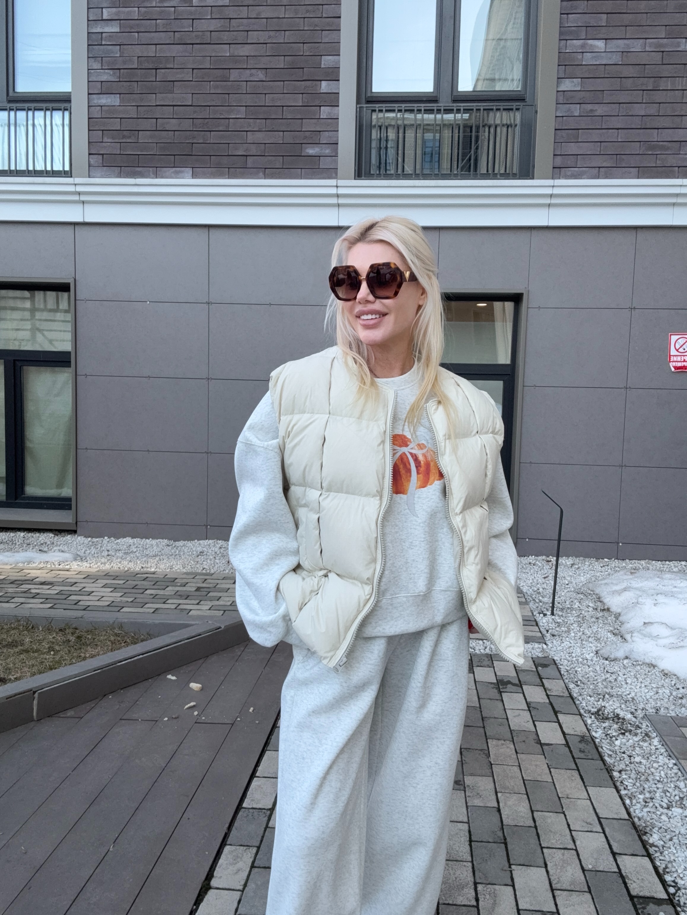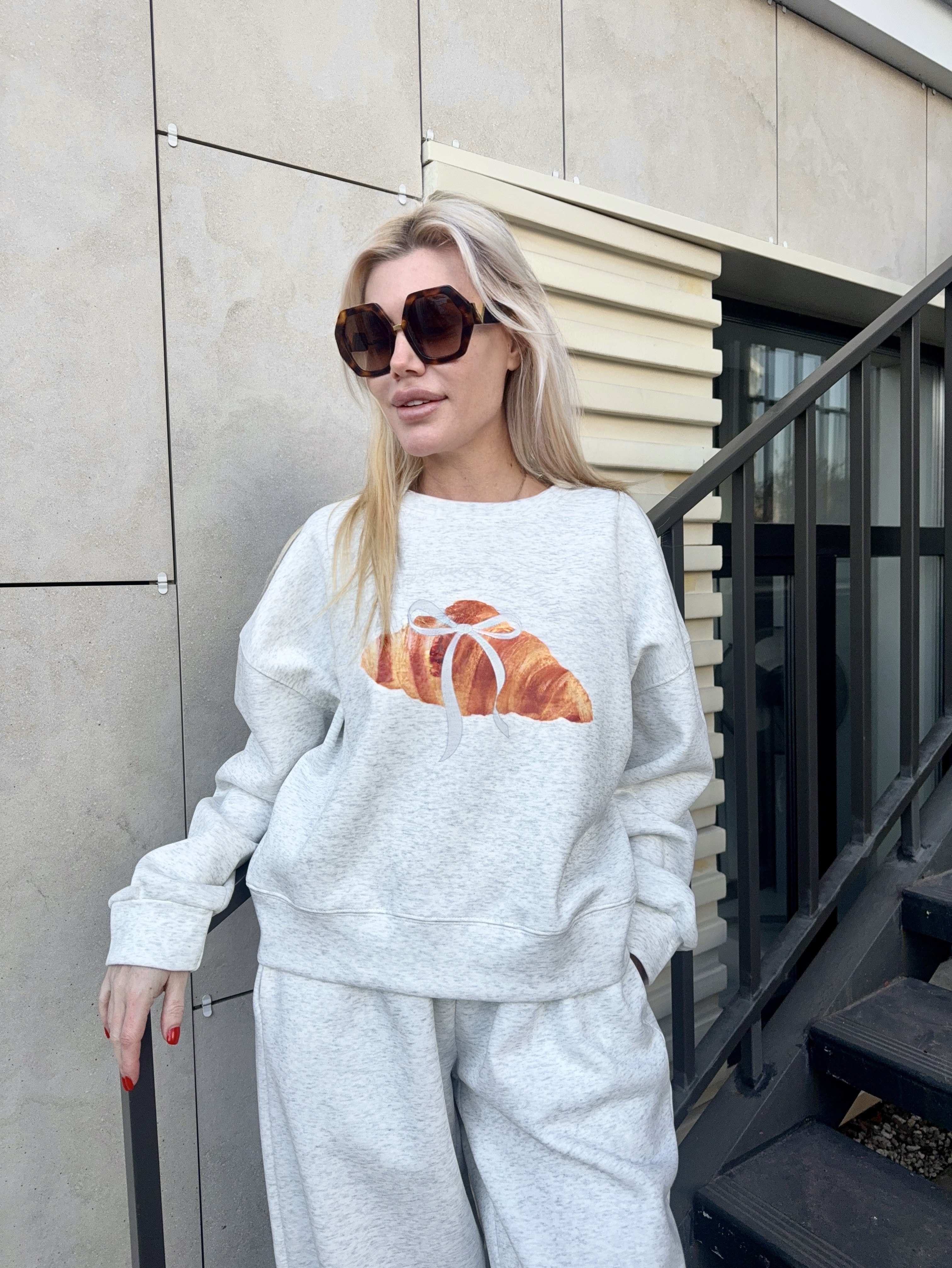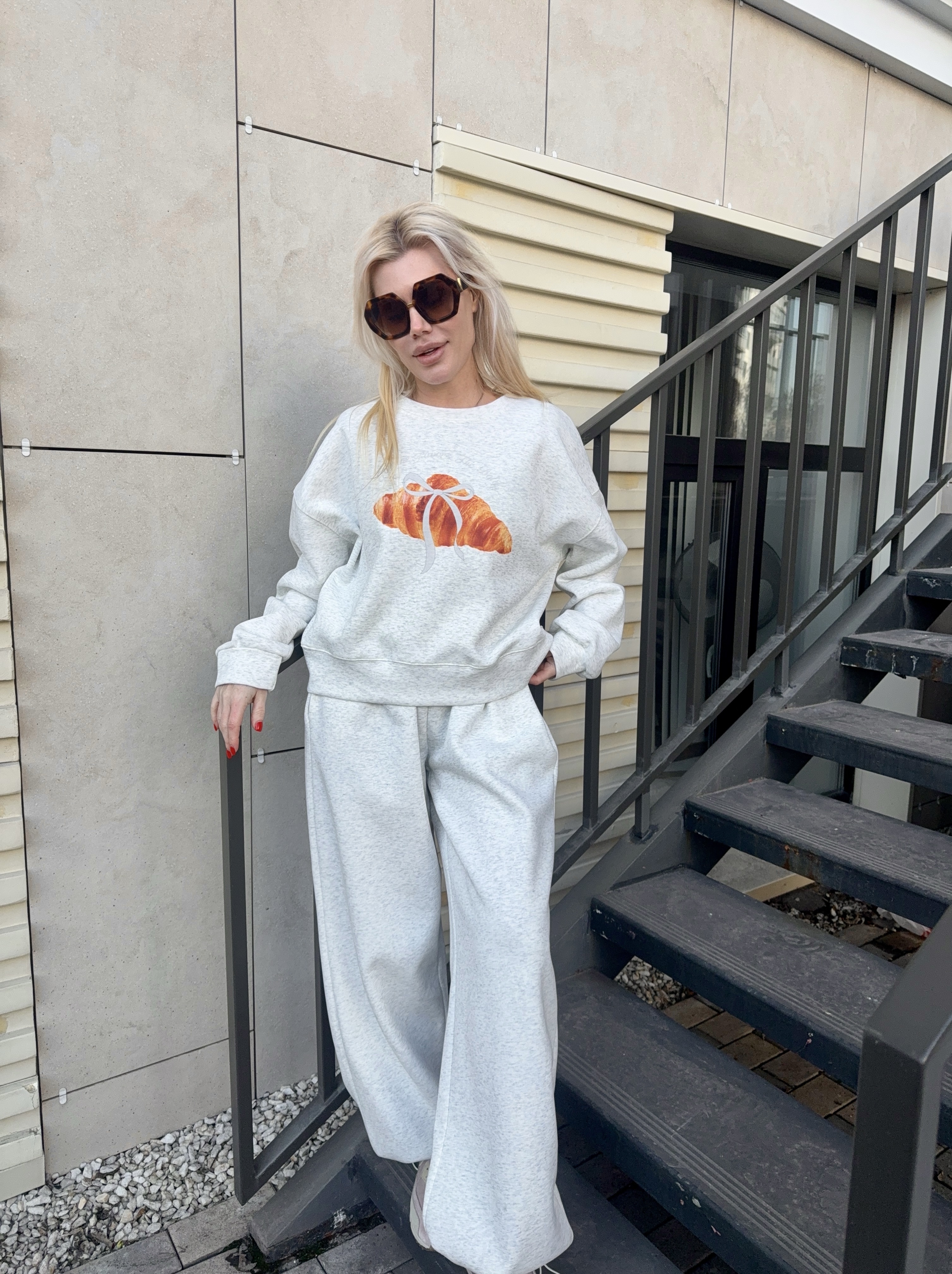 Укороченный свитшот и брюки-шаровары на кулиске делают модель универсальной.